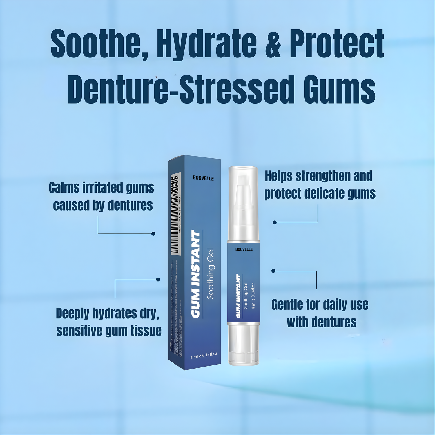 Wearing dentures shouldn’t mean living with irritated, inflamed, or painfully dry gums. Boovelle™ Hyaluronic Gum Gel is formulated to deeply hydrate and soothe gum tissue—helping reduce discomfort caused by constant denture pressure and friction.